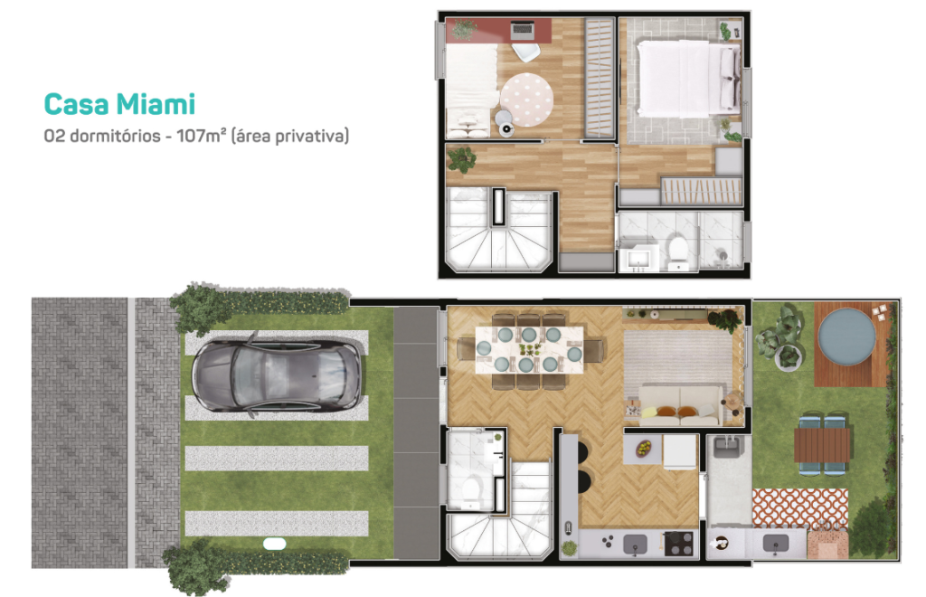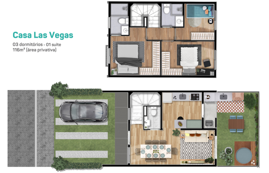 casas de 2 e 3 dormitórios, com plantas bem distribuídas e 107m² a 116m² de área privativa.